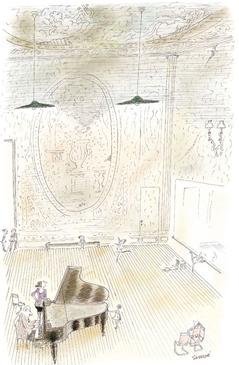 是小淘氣尼古拉在一間室內,彈奏表演鋼琴的插畫,因為在這張