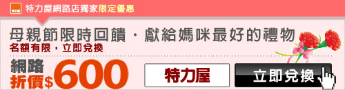 即日起至2011/4/30止,前往活動網站填下資料,即可馬上獲得特力屋獨家好禮~網路折價券$600元!