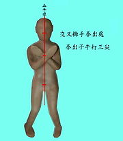 (上圖,二字羊馬樁與子午中線,示意圖。圖片出自維基百科。)