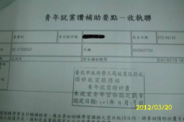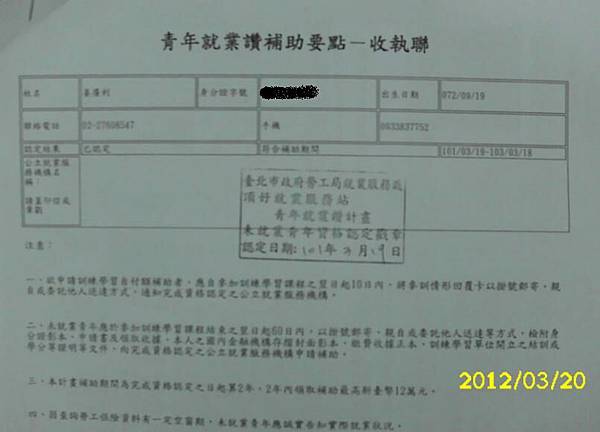 (上圖,我的「青年就業讚」審核方案資格符合通過影印本。)