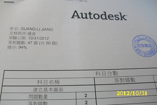(2012-10-31)今天的AutoCAD2011國際認證考,通過啦!哈哈哈!