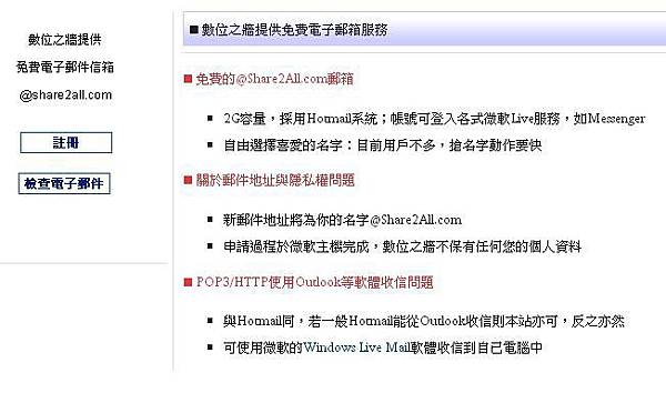 友站連結。「數位之牆」提供,少數無須手機驗證的免費郵箱e-mail。