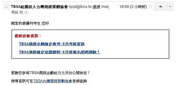 TBSA商務企劃初階認證考試,今天在官網公佈了三月份的會考成績。