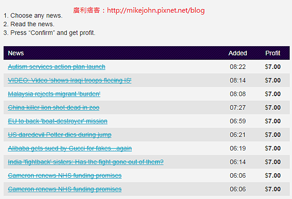 下圖三:閱讀完畢,每點一則是賺七塊美金喔!